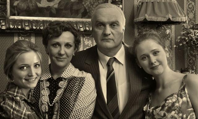 «Плачу от того, что сыграл не так и никогда уже не сыграю, как надо». С «женой» Еленой Яковлевой и «дочерьми» Марией Буравлевой и Татьяной Рыбинец в сериале «Жуков», 2012 год